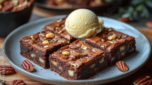 Deliciously rich and fudgy chocolate brownies topped with a scoop of vanilla ice cream and sprinkled with nuts