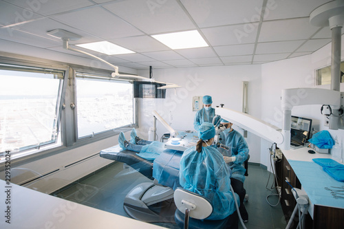 Dentist during a dental intervention with a patient. Dental clinic concept.