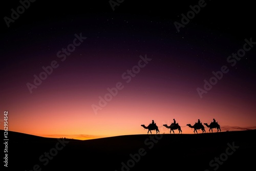 Desert camel caravan at sunset. Silhouette of travelers at dusk. Possible use for travel posters