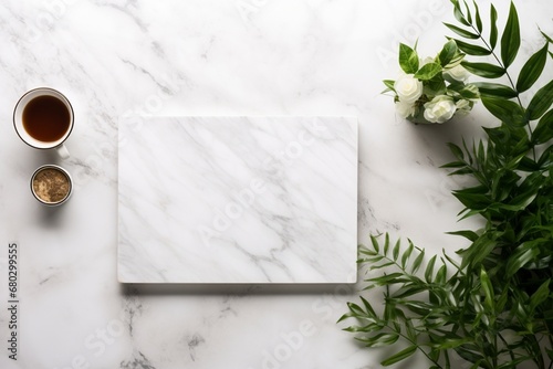 Desk aesthetics: Top view of desk with keyboard, tablet, coffee, plants on marble, ready for text.