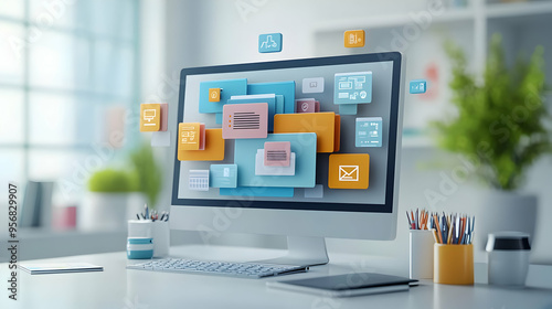 Desktop and Files Icons with Document Sharing text isolated on white background concept as Camera movement Focus on the desktop and files icons emphasizing document sharing during virtual meetings. Sc