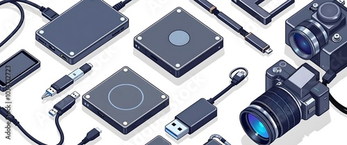 Detailed isometric vector of digital devices including hard drive, USB flash drive and digital camera all placed on white background