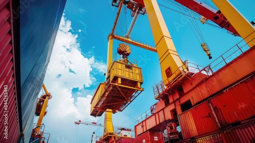 Detailed view of crane machinery at port side view Engineering marvel technology tone Tetradic color scheme