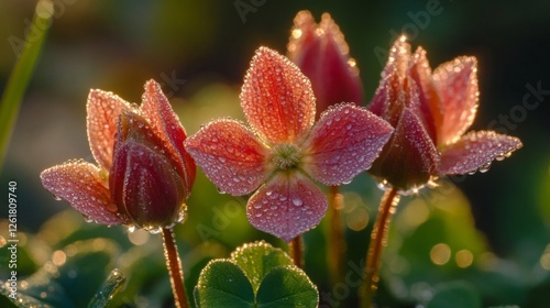 Dewdrops glisten on three reddish pink flowers at sunrise