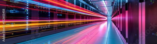 Digital data in motion Long exposure inside a data center showing the movement of light as a metaphor for streaming data, emphasizing the beauty and complexity of modern computing
