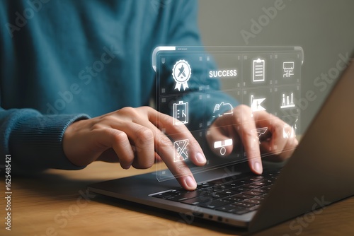 Digital Productivity: Hands meticulously navigate a laptop keyboard, with interactive holographic interfaces symbolizing the achievement of success and efficiency.