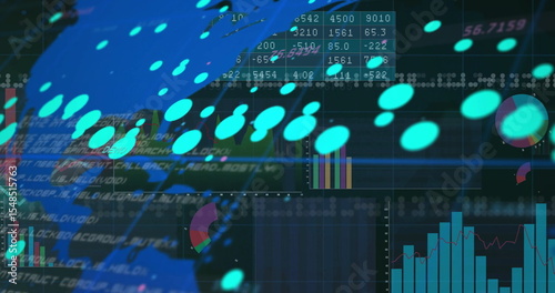 Displaying turquoise data points over dark interface, showing code, tables, charts, world map