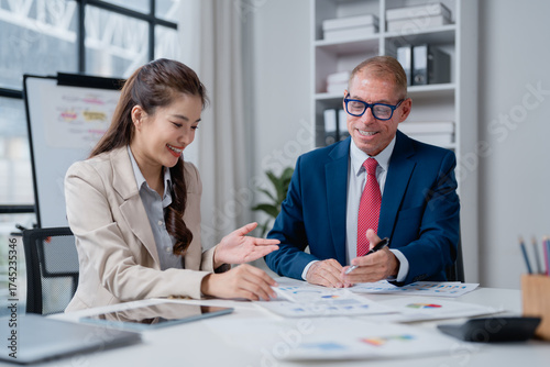 Diverse business colleagues reviewing financial reports and discussing strategy during a professional meeting in a modern office setup, smiling and engaged in shared teamwork