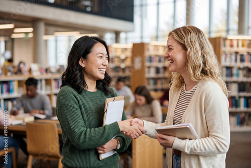 Diverse female students shaking hands in celebration at library