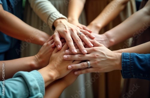 Diverse hands join in unity. People from different backgrounds come together. Symbol of harmony. Showing group cooperation, teamwork. Friendly connection. Social concept. Concept of international