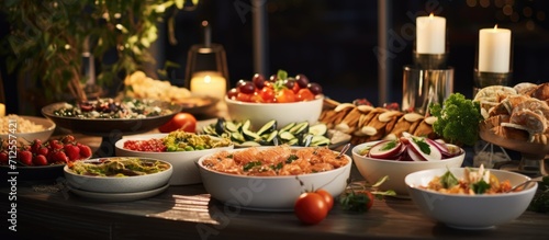 Diverse snacks and dishes for holiday on buffet table. Beautifully decorated banquet table with food and appetizers.