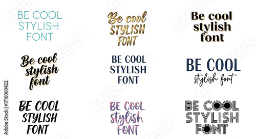 Diverse typography showcasing the phrase 'Be Cool Stylish Font' in various creative styles and colors