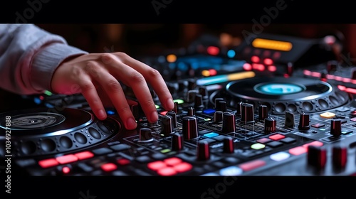 DJ hand mixing on turntables, vibrant music scene for nightlife enthusiasts, print for National DJ Day