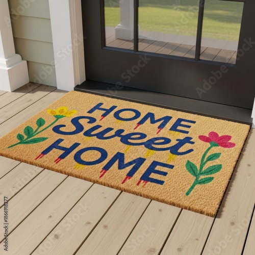 Doormat with "Home Sweet Home" text and floral designs, placed outside a house entrance