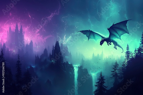 Dragon Soaring Over a Foggy City with Purple and Green Skies