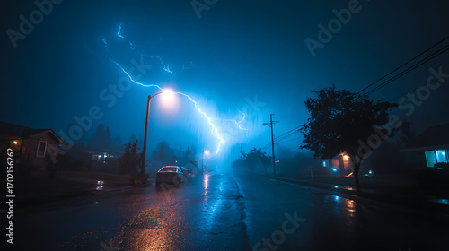Dramatic lightning illuminates a rainy suburban street during a stormy night, creating an eerie atmosphere