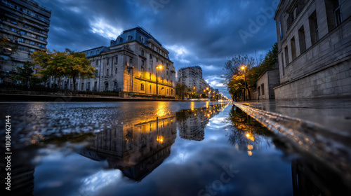 Dramatic Reflection on Wet Streets After Rainfall Captured in Cinema Style with Rich Colors and Atmospheric Cloudy Sky