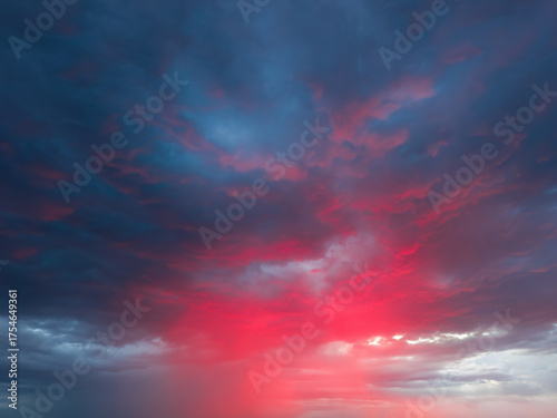 Dramatic sky with storm clouds illuminated by red sunset or sunrise. Vivid colorful cloudscape for nature banner or weather background. Bright sunset or sunrise light.