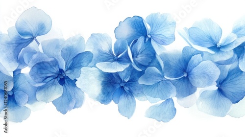 Dreamy watercolor blue hydrangea with detailed petals, floral botanical illustration, isolated on white