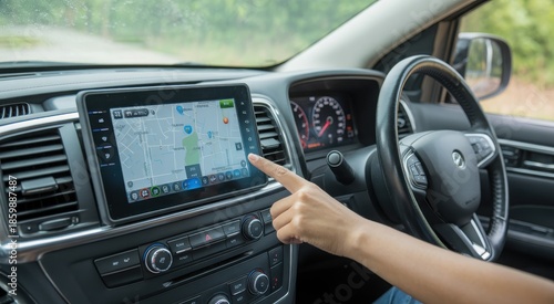 Driver using the digital map navigation system on a modern car's dashboard touchscreen while parked