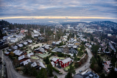 Drone or aerial photo from Oslo, Norway. Shot in late November in blue hours. Winter is coming. Ground and trees are covered with snow frost, the lakes are freezing up.