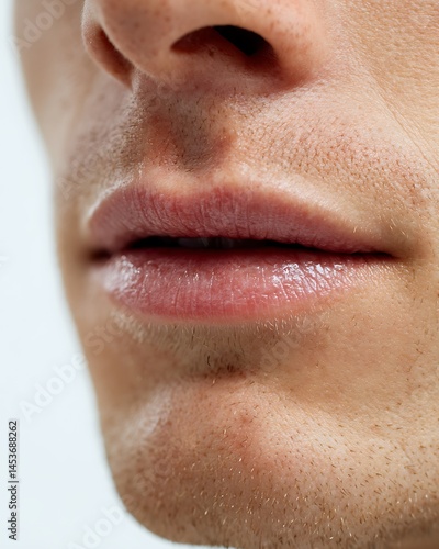 Dry cracked lips of a white man, showing the problem of lip balm for health purposes.
