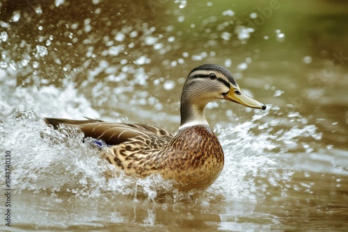 Duck splashing into a pond on a serene farm, motion blur showing the flurry of water and feathers in the moment, water, nature, farm, playful, animal