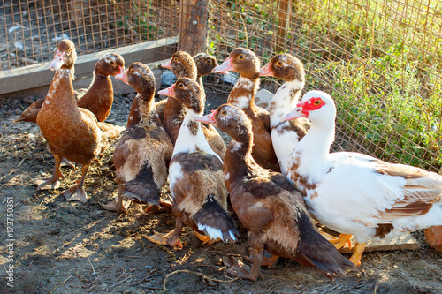 Duck with ducklings on a traditional poultry farm.