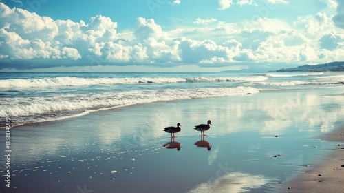 Ducks walking along a serene beach with gentle waves and dramatic clouds reflecting on the wet sand during a tranquil day