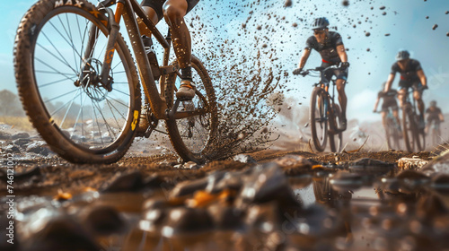 Dynamic 3D scene of a mountain bike race rugged terrain realistic textures of mud and rocks cyclists navigating obstacles immersive perspective