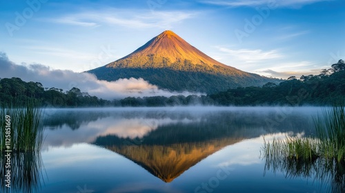 Early morning light casts a warm glow on a volcanic mountain, reflected in the still waters of a pristine lake, with mist rising from the surface