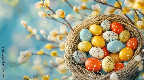 Easter arrangement featuring birds nest filled with vibrant eggs, with copy space