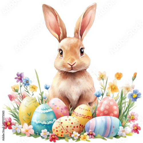 Easter Bunny Amidst Eggs: A charming watercolor illustration of a sweet bunny surrounded by colorful Easter eggs and spring flowers.