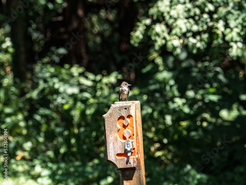 Eastern Wood-Pewee on a campsite sign