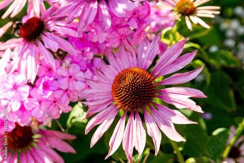 Echinacea purpurea (eastern purple coneflower) blooming among pink phlox in the summer garden. Closeup