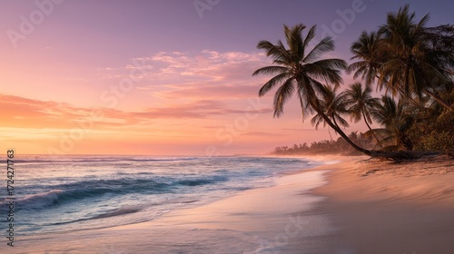 Editorial tropical coastal scene, golden light over calm ocean and palm silhouettes, evoking travel lifestyle inspiration, seasonal relaxation, tourism escape, cultural holida
