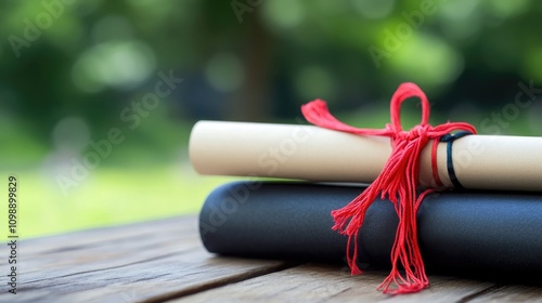 Educational Certificate Rolled Up on Wooden Surface with Red Tassel and Black Notebook Surrounded by Lush Green Background Representing Academic Achievements
