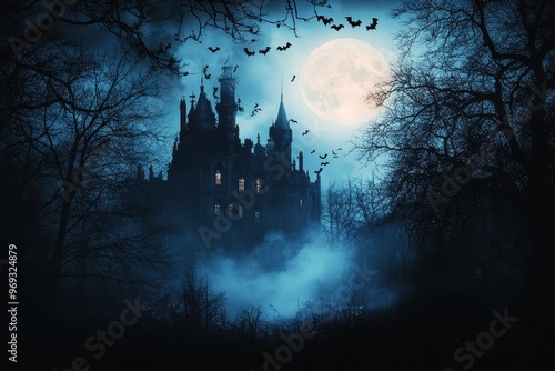 Eerie Retro Haunted Castle at Night with Bats Flying in Moonlit Sky for Text Overlay - Spooky Halloween Background