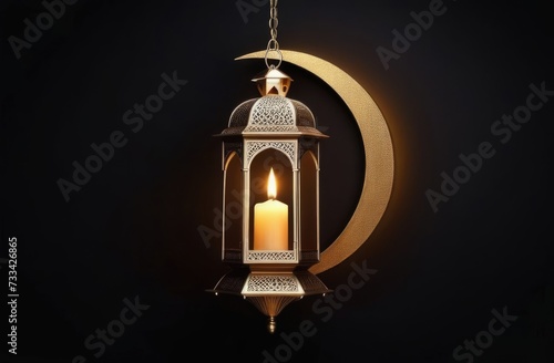 Eid al-Fitr, holy month of Ramadan, Laylat al-Qadr, hanging Arabic lantern fanus, candles, golden crescent moon, magical atmosphere, dark background
