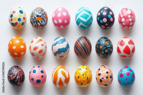 Eighteen Easter eggs with colorful modern designs lay on a white surface. Great for Easter cards, holiday promotions, spring events, and art projects.