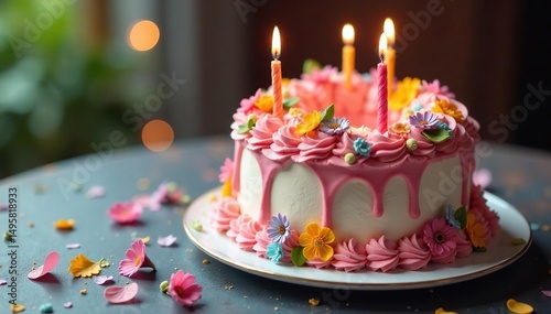 Elaborate birthday cake decorated with flowers, intricate design , colors, design