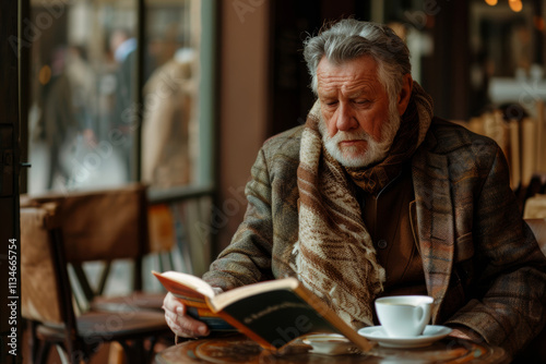 Elderly man reading in cozy cafe with warm scarf and coffee