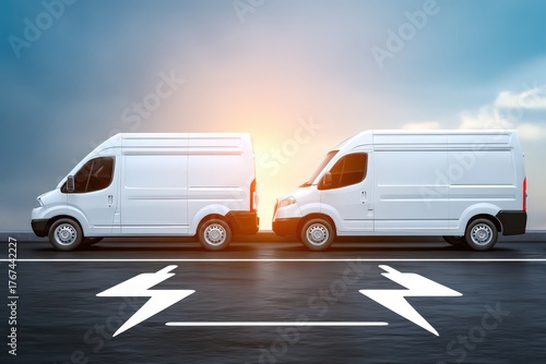 Electric delivery vehicles positioned on a highway with striking sunrise highlighting their sleek designs while emphasizing eco-friendly transportation and urban logistics progression