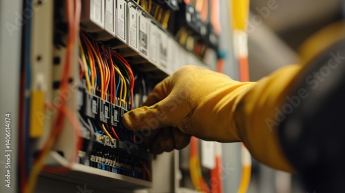 Electrician securing wiring inside a breaker panel. Featuring electrical safety and precise installation