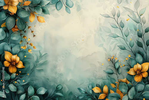 Elegant abstract background featuring golden leaves with a soft teal gradient and artistic splashes of texture.