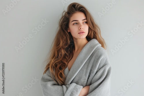 Elegant And Youthful Woman Posing In Grey Bathrobe On White Background