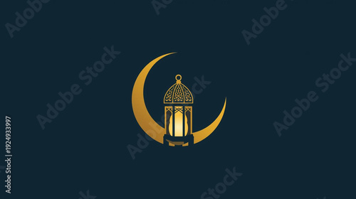 Elegant golden lantern suspended within a serene crescent moon on a dark background viewed from a straightforward perspective as an illustration