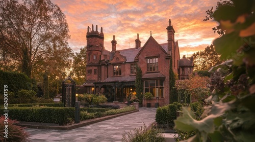 Elegant mansion illuminated at dusk surrounded by lush greenery, showcasing architectural beauty and peaceful ambiance in a serene setting