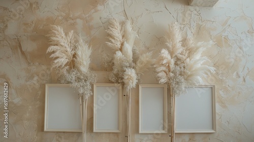 Elegant Neutral Decor with White Frames and Pampas Grass Arranged on Textured Wall