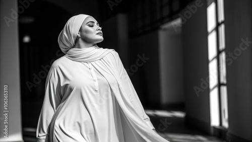 Elegant Plus-Size Woman in Hijab, Black and White Modest Fashion Portrait